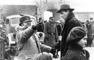 Steven Spielberg com Liam Neeson no set de A Lista de Schindler[/caption]