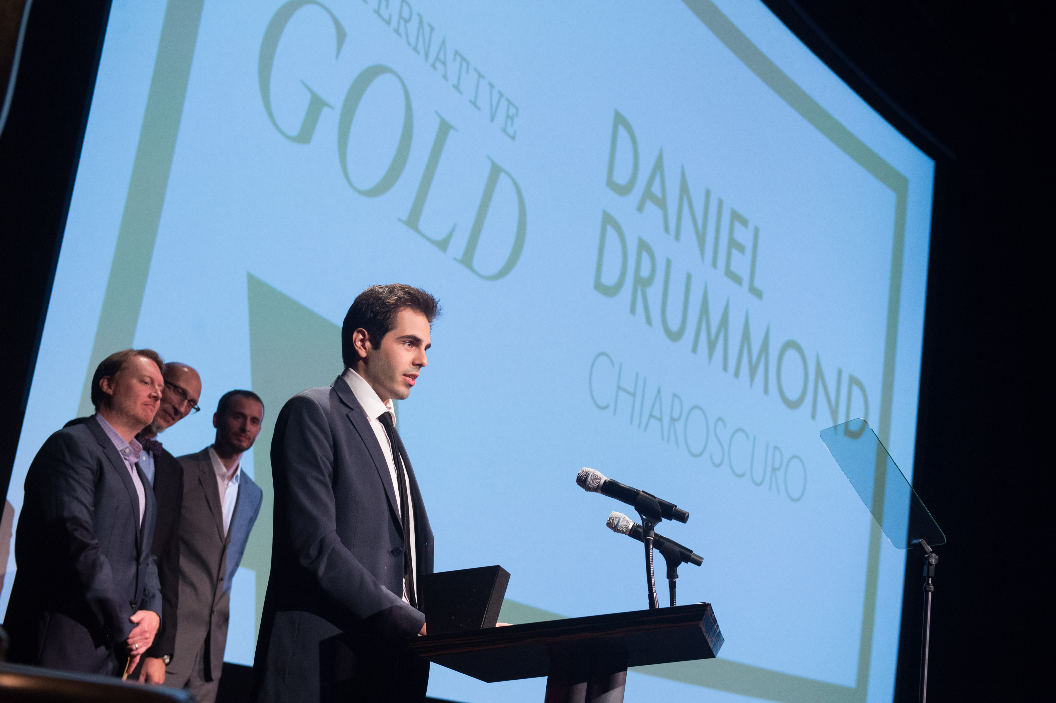 Daniel Drummond recebendo o prêmio e atrás Roy Conli, Don Hall e Chris Williams (time vencedor do Oscar por Operação Big Hero 6)[/caption]