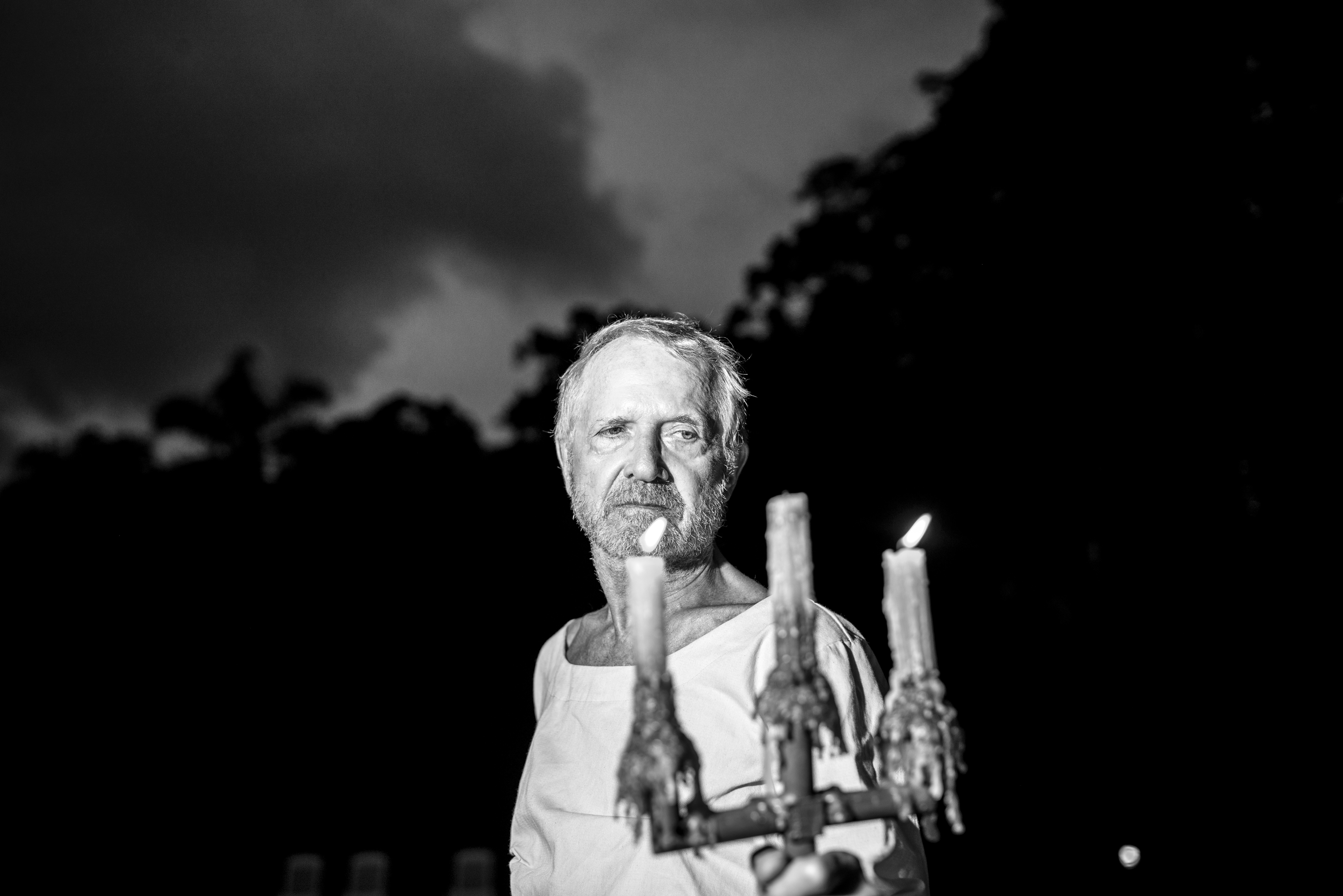 O crítico de cinema Jean-Claude Bernardet, que faz o papel do fantasma do rei morto, em Hamlet.[/caption]